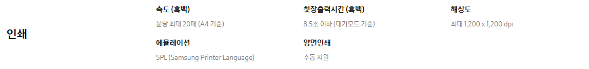 SL-M2030은 흑백 레이저 프린터로 일반 프린터에 비해 흑백용지 인쇄 속도가 아주 빠른편입니다. A4용지 흑백 기준으로 분당 최대 20페이지(PPM) 출력이 가능하다고 합니다. 18PPM정도의 속도가 일반적인걸 생각해보면 20PPM은 아주 빠른 속도라고 할 수 있습니다.